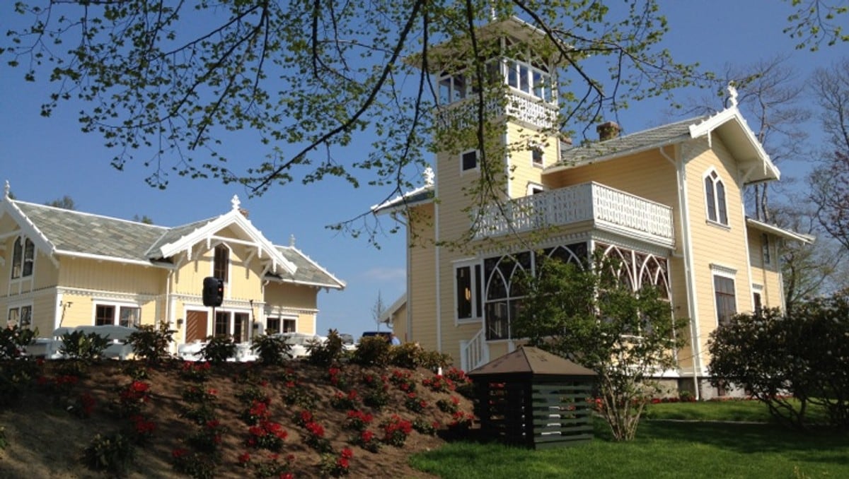 tilbakeført til fordums prakt for mer enn 30 millioner kroner.Rundt bygningene ligger en fantastisk fin hage som også er restaurert.